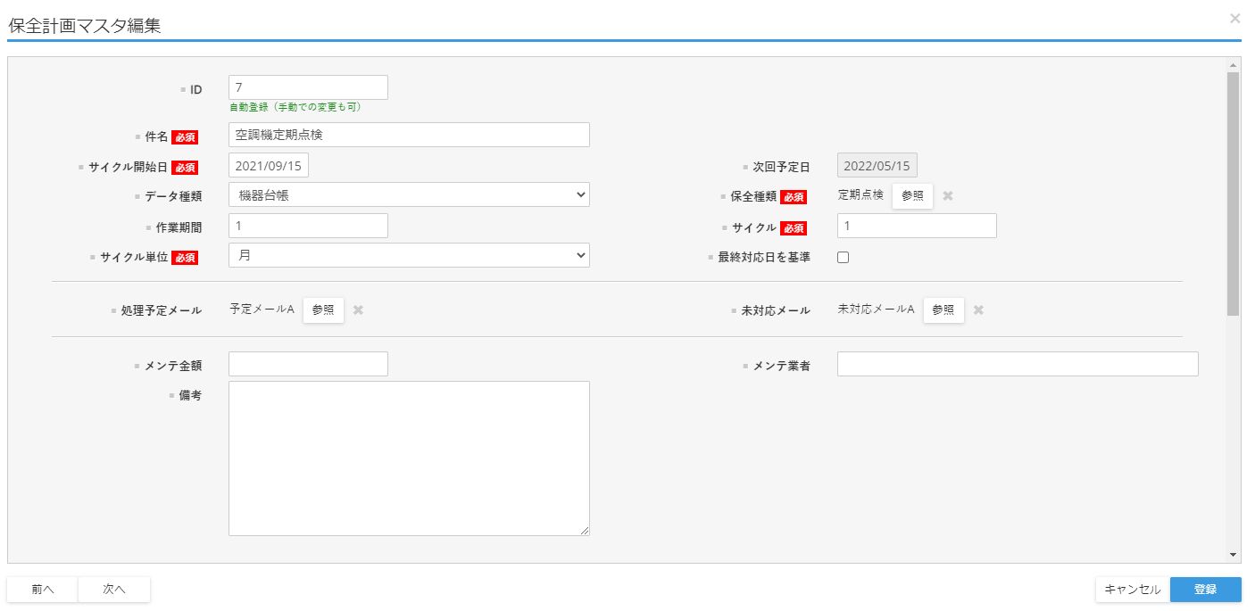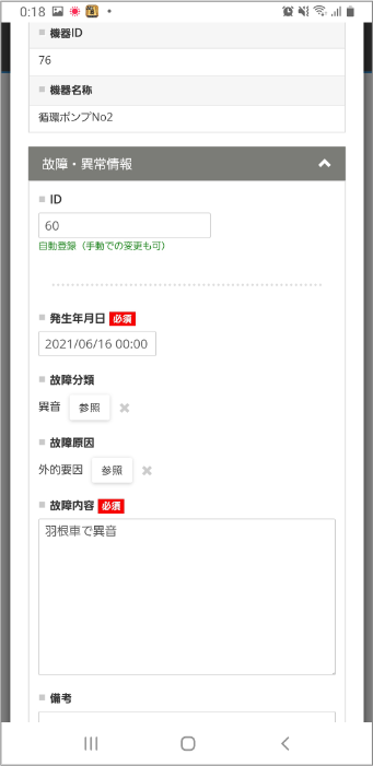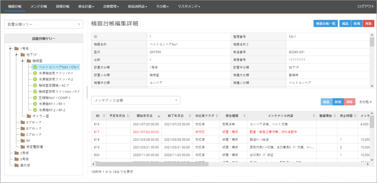 機器、メンテ、故障、部品など各種台帳で登録できます。
