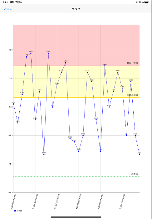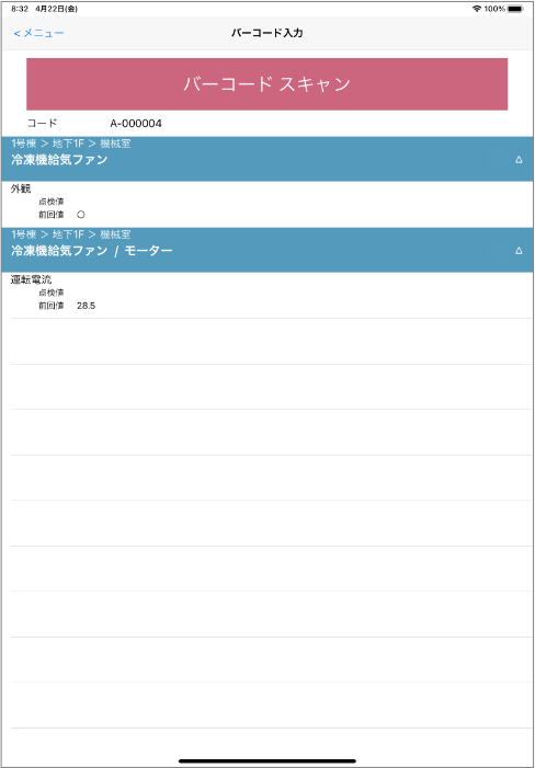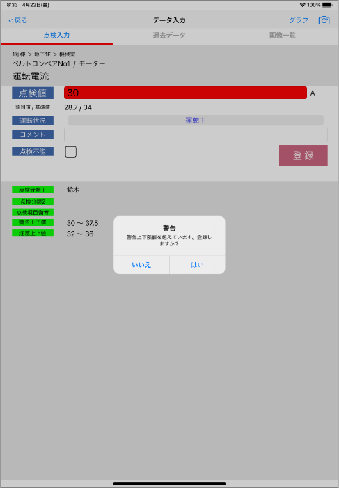 iPhone/iPad、Android、Windowsタブレット用の点検アプリで点検結果を入力、バーコードを使った入力や、異常値の判定、グラフの表示、写真撮影、点検結果の一覧表示に対応しています。