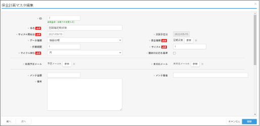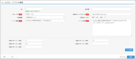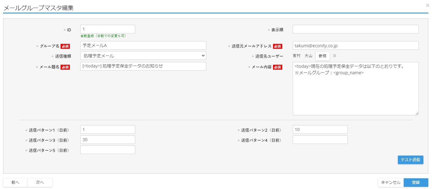 保全予定日の前、もしくは保全予定日を過ぎた後、任意のメールアドレスをグルーピングして一斉告知します。メール送信日付は複数設定することが可能です。