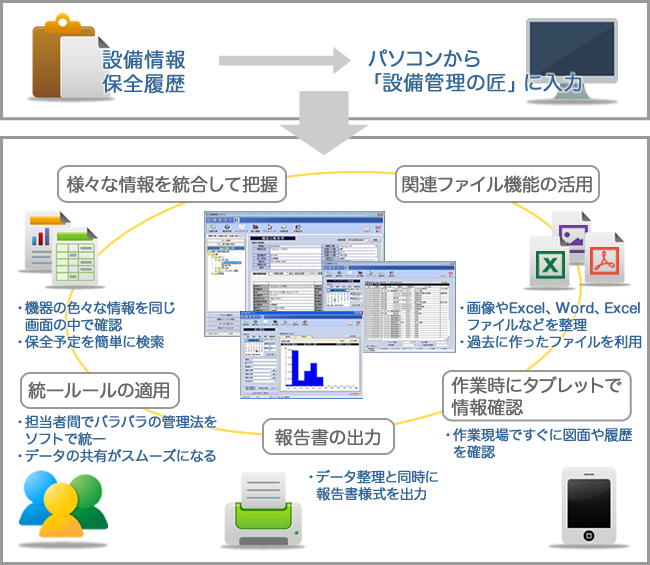 「設備管理の匠」の導入によって、こうした情報をうまく整理できます。