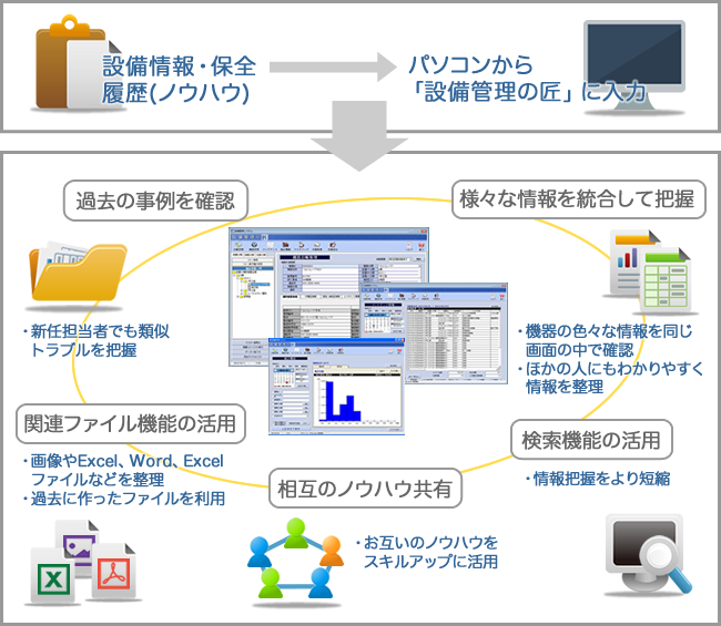 設備管理の匠は構内LANを介して、複数の人が同じデータベースを確認することができるので情報共有が実現できます。