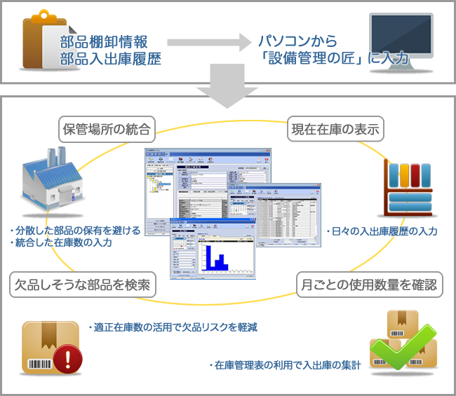 「設備管理の匠」をうまく運用すれば、こうした部品在庫のお悩み解決に一歩近づきます。