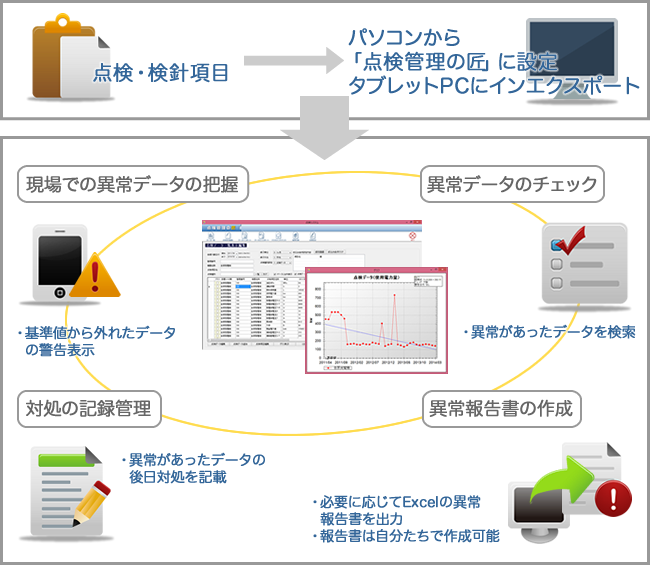 「点検管理の匠」ではタブレットPC上で異常の警報を出したり、データベース上で異常を検索・対処を記述することができます。