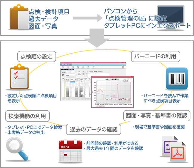 例えば、点検基準や機器写真、機器の場所の図面などを登録し、タブレットPCに転送しておけば、作業に不慣れな人が迷っても、そのファイルを開けばすぐに疑問を解消することができます。